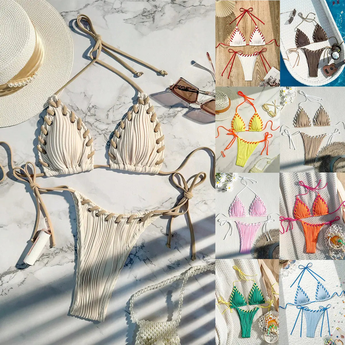 Sexy solid color bikini set featuring a brief-style, rope tie accents, and multiple color options. Made from comfortable polyester, this swimsuit is perfect for vacations, beaches, and swimming.