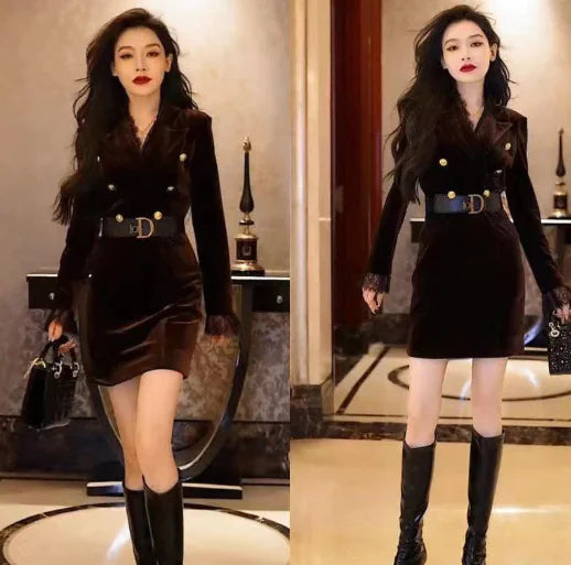 Elevate your wardrobe with our Women's Fashionable Suit Lapel Slim-fit Sheath Dress. This stunning piece features a sleek solid color design available in Black and Coffee, making it a versatile addition to your collection that transitions flawlessly from day to night.